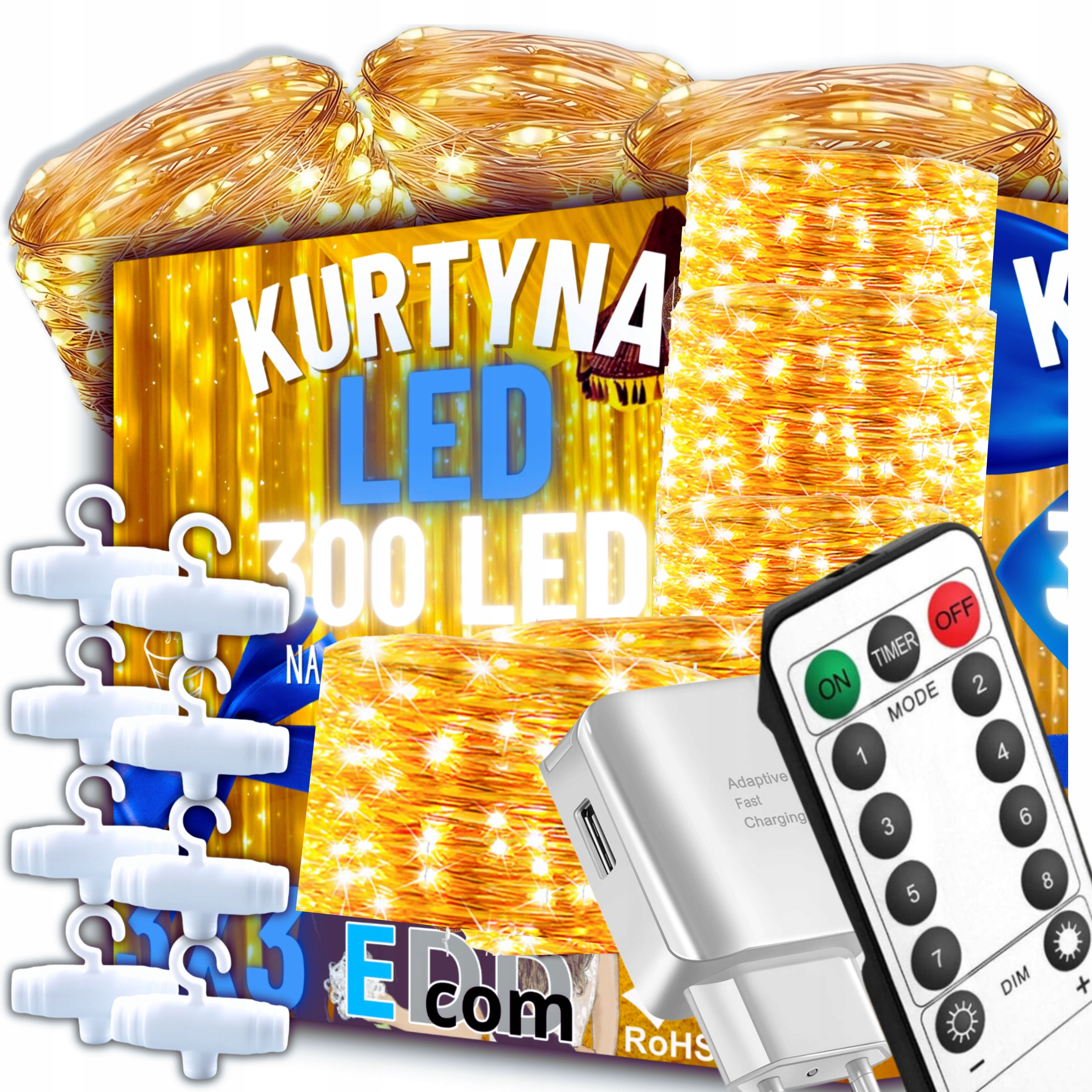 KURTYNA ŚWIETLNA 300 LED 3x3m SOPLE LAMPKI GIRLANDA PILOT DRUCIKI BIAŁE