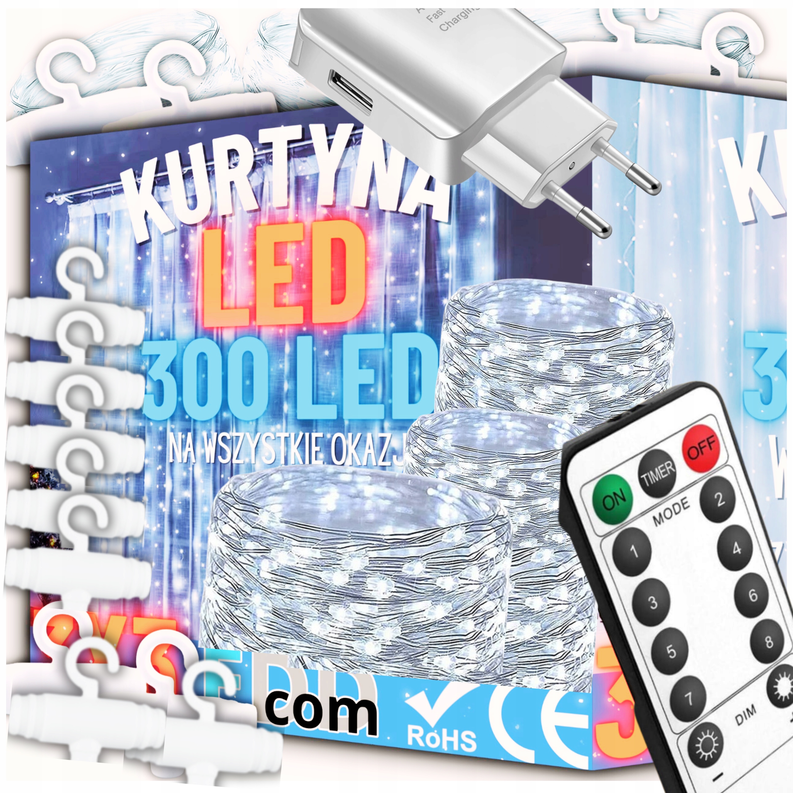 KURTYNA ŚWIETLNA LAMPKI 300 LED 3x3m SOPLE WISZĄCE GIRLANDA DRUCIKI BIAŁY