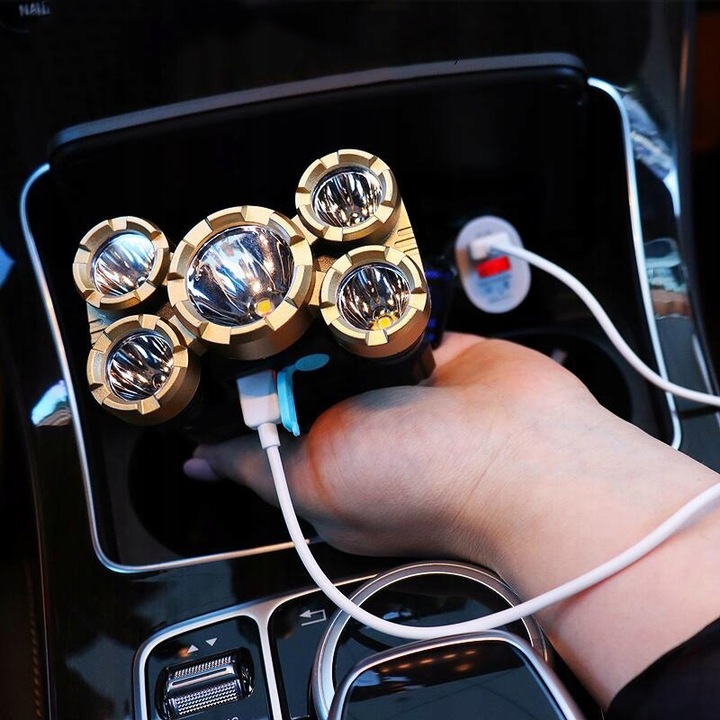 Nasza latarka została wyposażona w aż pięć diod LED, z czego jedna duża dioda znajduje się w centralnej części, a cztery mniejsze są rozmieszczone dookoła. Taki układ diod zapewnia wyjątkowo mocny i równomierny strumień światła, umożliwiając oświetlenie nawet bardzo odległych obiektów.