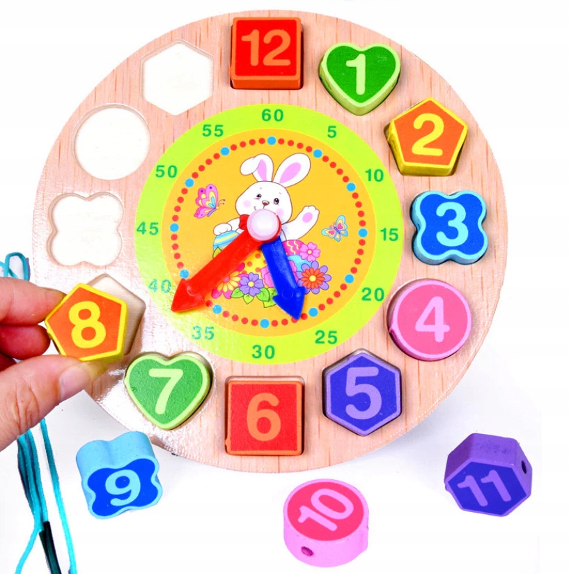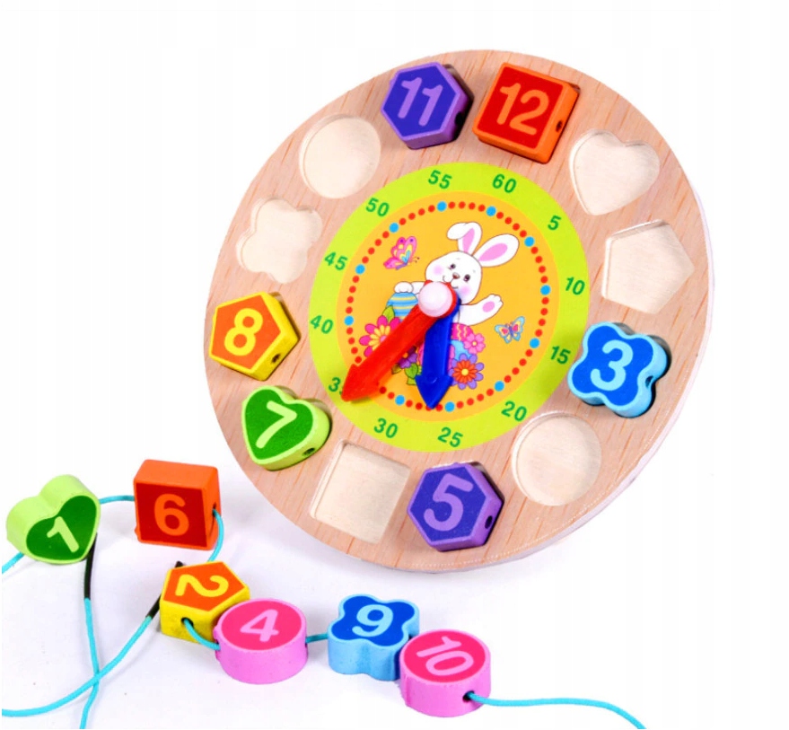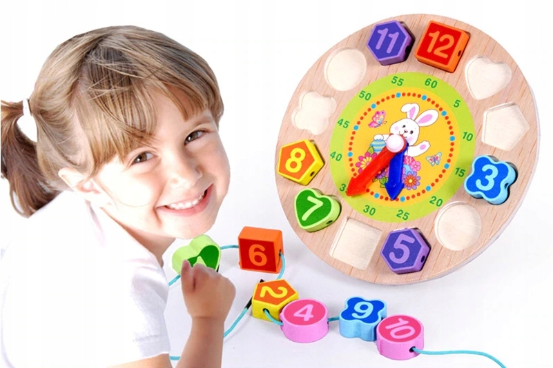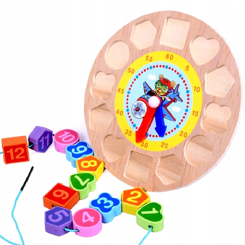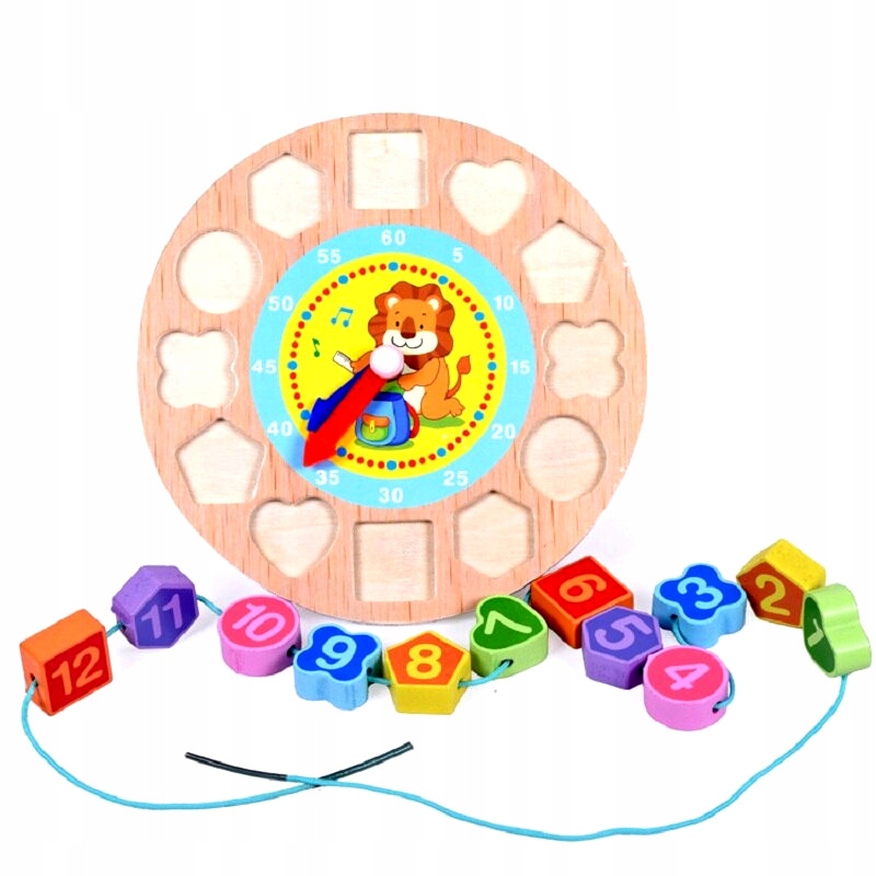 Nasz sorter drewniany to świetna zabawka, która pomaga dzieciom w nauce liczb, kształtów i kolorów. Zegar z klockami do nawlekania uczy również pojęcia czasu.