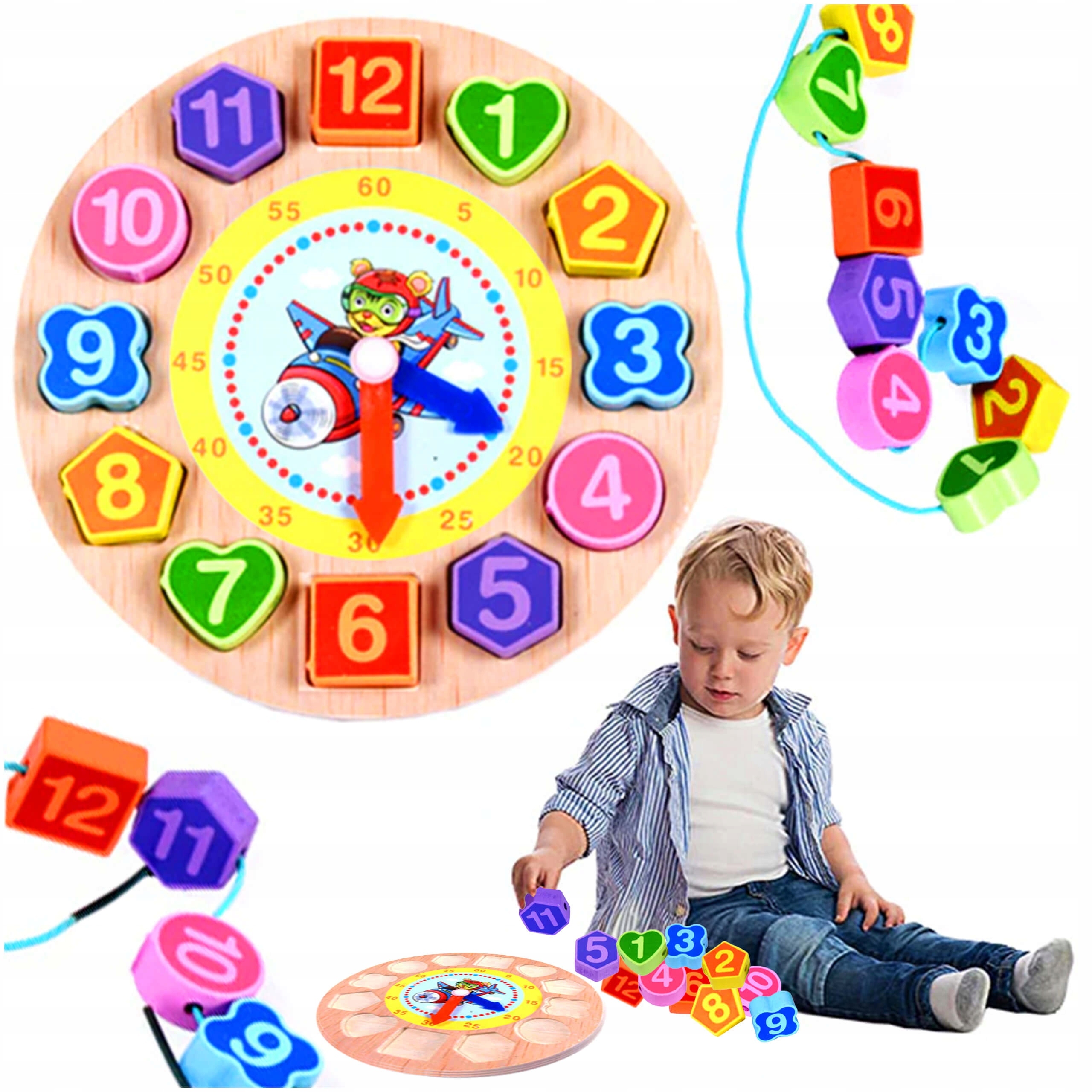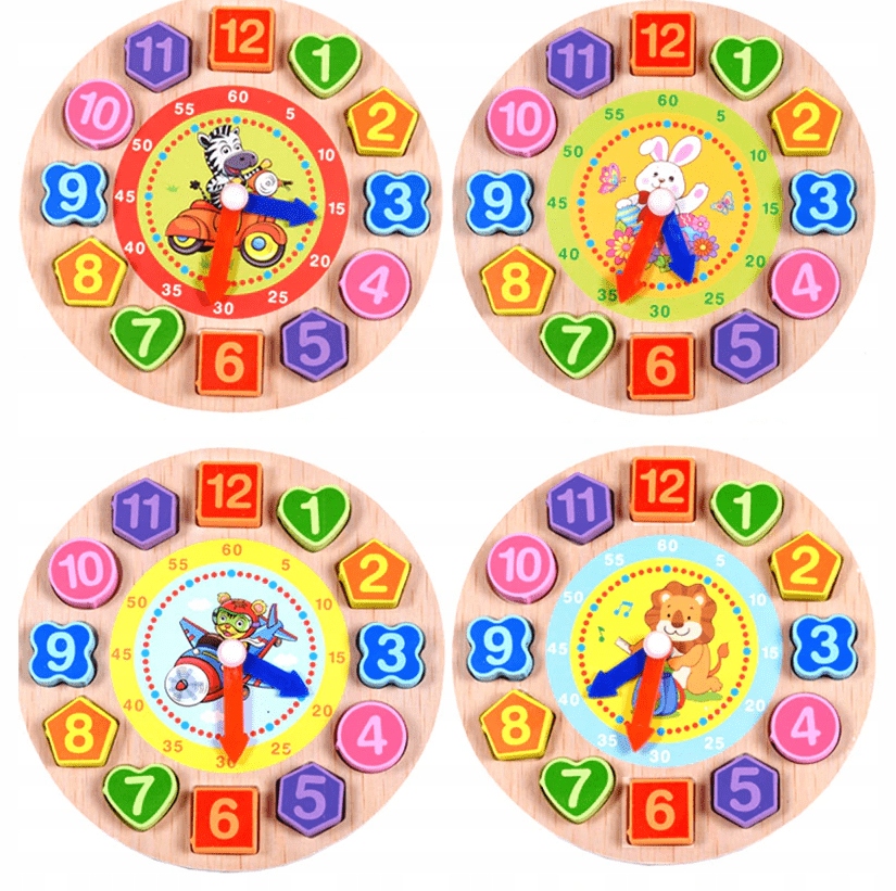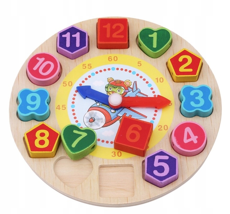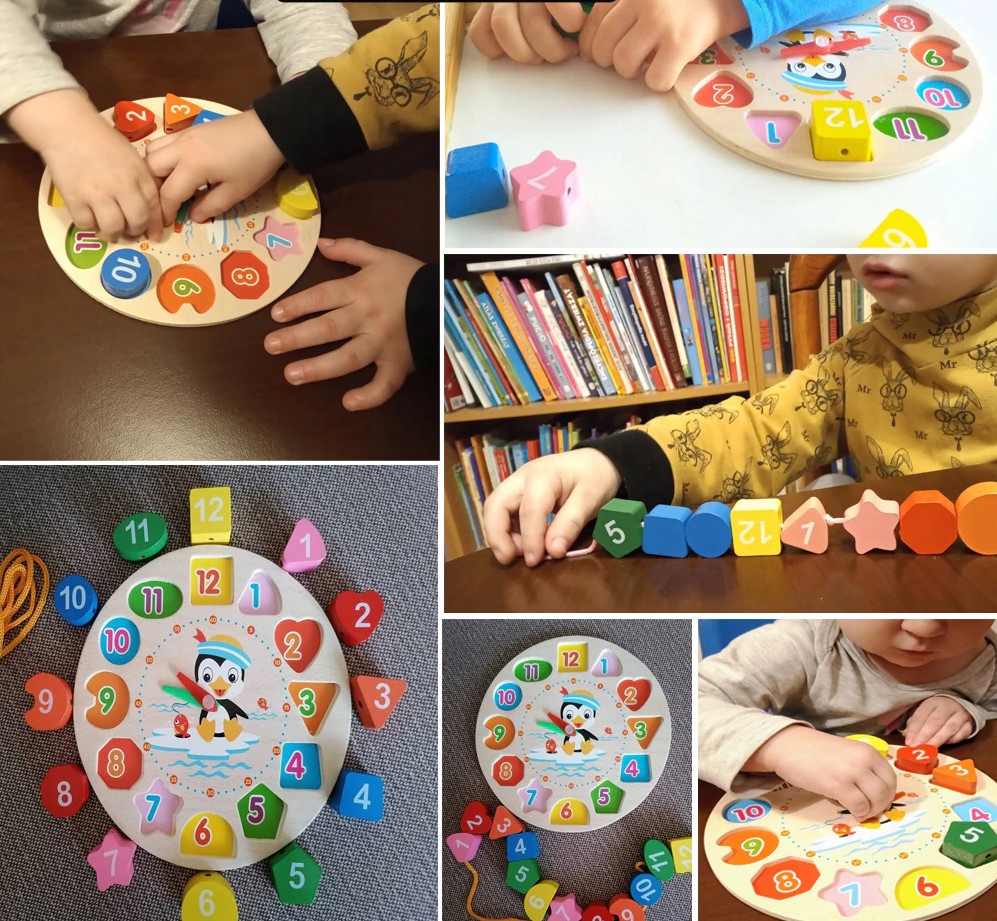 Nasz sorter drewniany to świetna zabawka, która pomaga dzieciom w nauce liczb, kształtów i kolorów. Zegar z klockami do nawlekania uczy również pojęcia czasu.