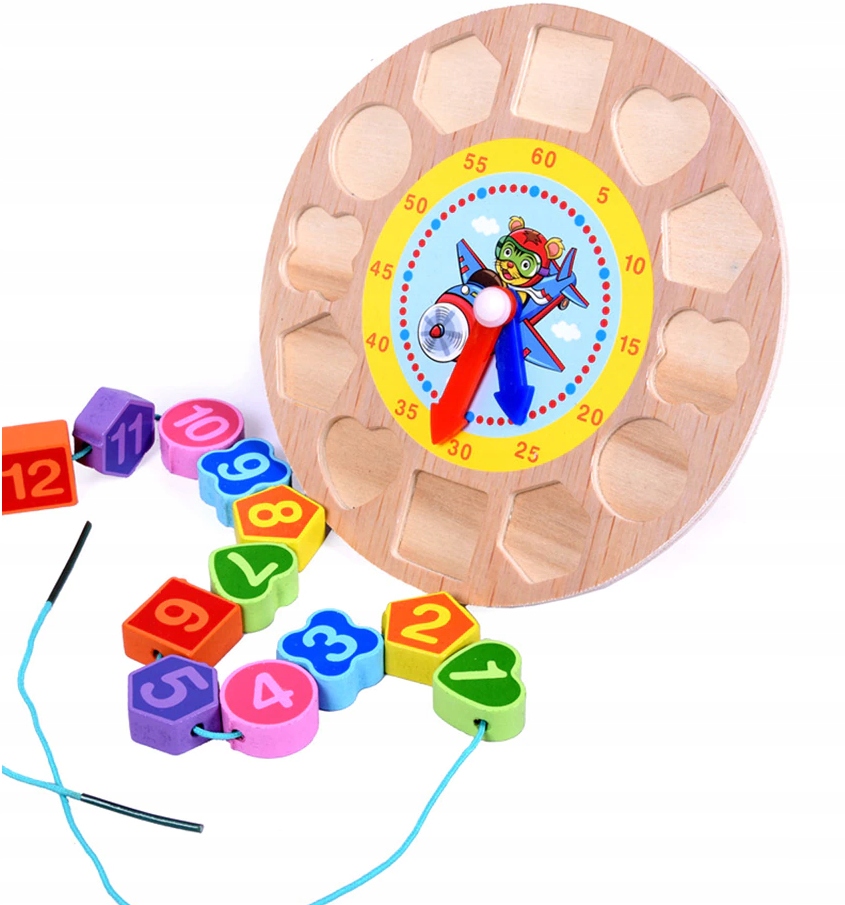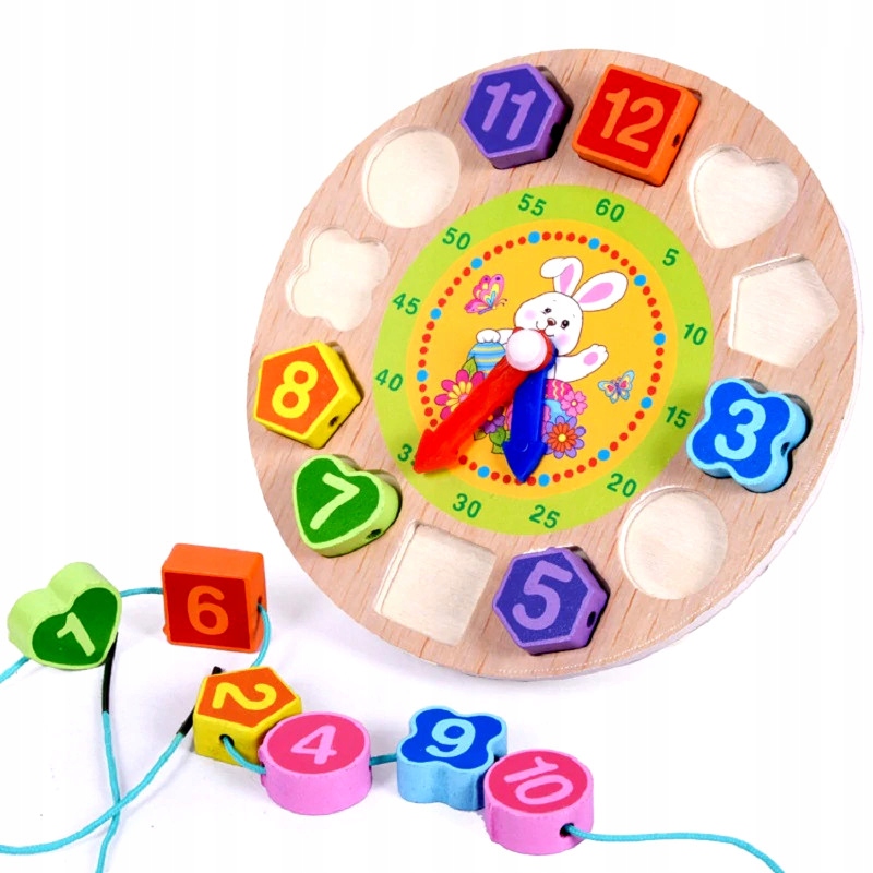 SORTER DREWNIANY ZEGAR KLOCKI KORALIKI DO NAWLEKANIA UKŁADANKA EDUKACYJNA